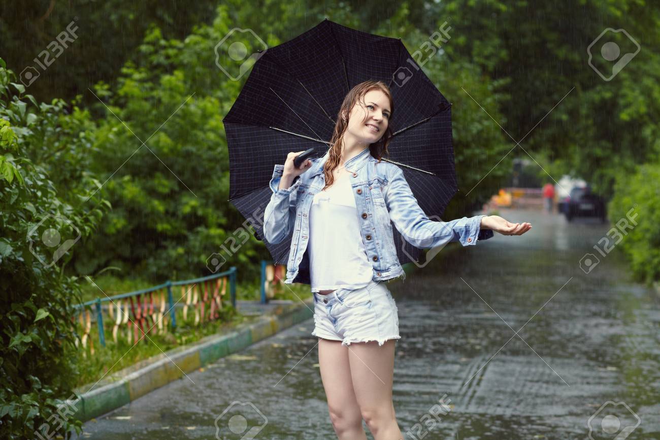 Happy Beautiful Girl With An Umbrella In The Rain During A Forest