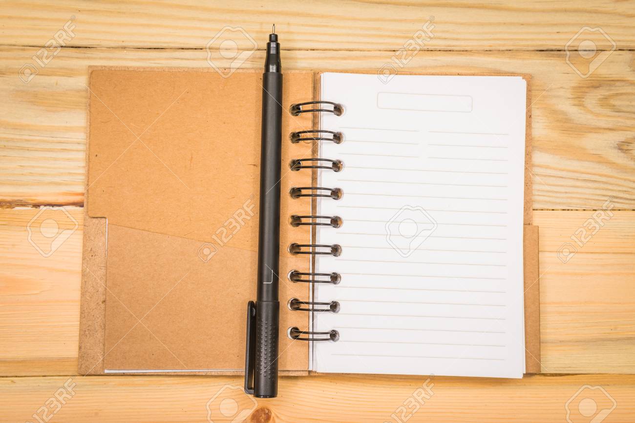 Close Up Opening Note Paper And Pen On Wood Texture Background
